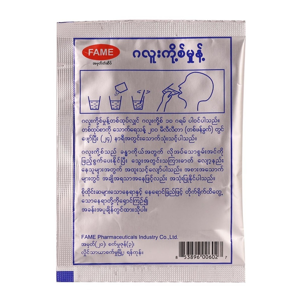 - ပါဝင်သောဆေးပစ္စည်းများ - ဂလူးကို့စ်မှုန့် တစ်ထုပ်လျှင် ဂလူးကို့စ် ၁၀ ဂရမ် ပါဝင်ပါသည်။